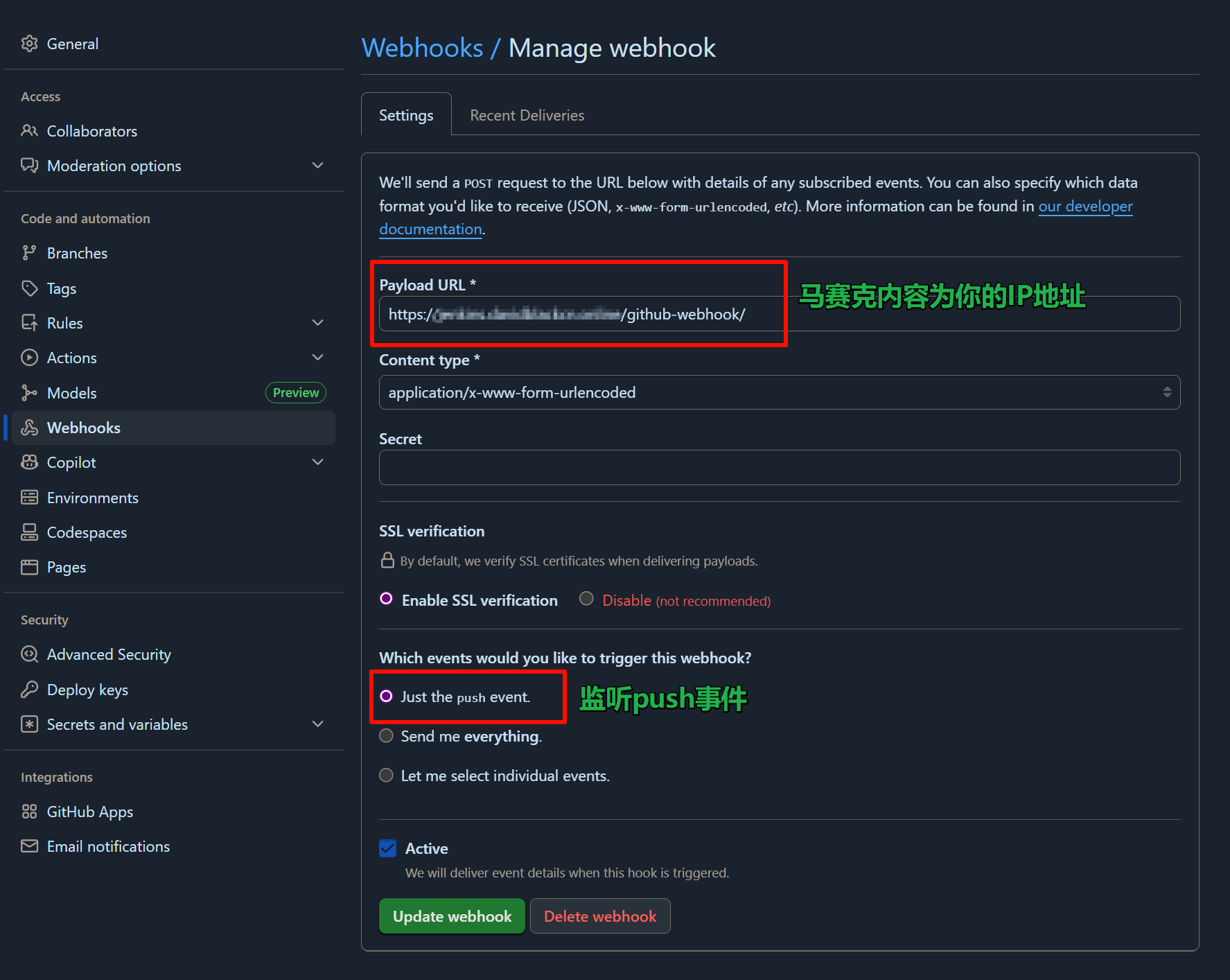 - 我们的预期是push后自动化构建,所以只需要push event,添加好以后测试连接