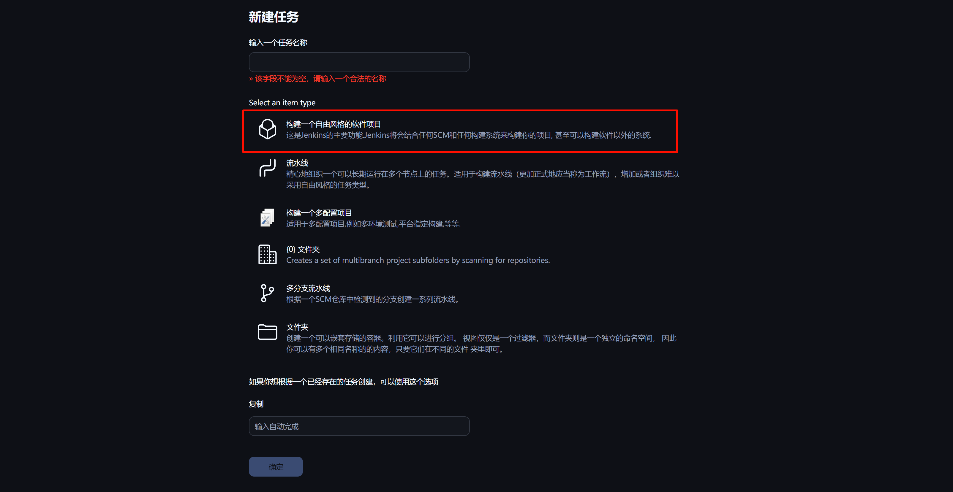 - 在Jenkins首页点击 新建任务 输入任务名称并选择 自由项目