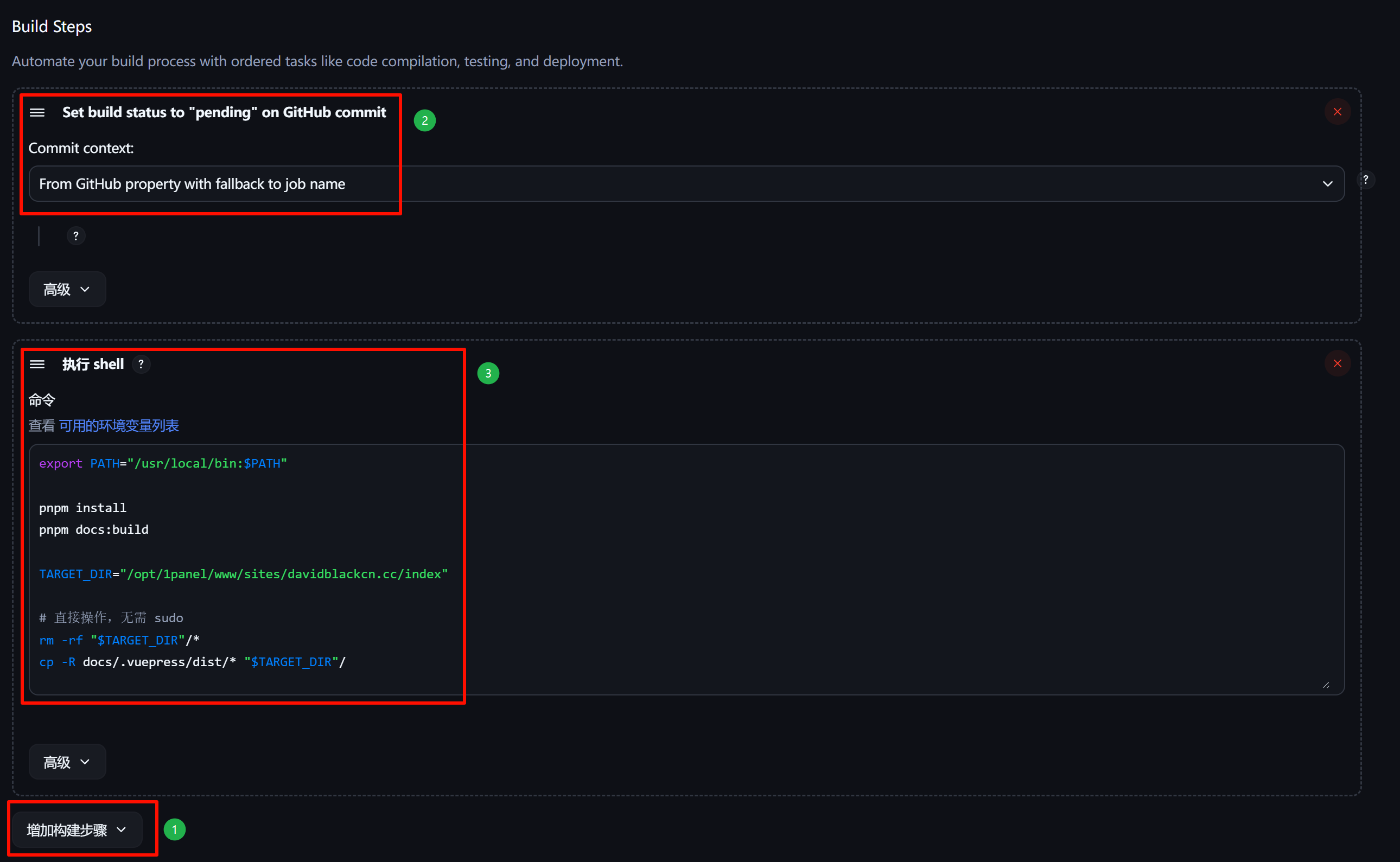jenkins ALL=(ALL) NOPASSWD: /bin/rm -rf /opt/1panel/www/sites/davidblack.cc/index/*, /bin/cp -R /var/lib/jenkins/workspace/VuePress-Blog-Deploy/docs/.vuepress/dist/* /opt/1panel/www/sites/davidblack.cc/index/将其中 /opt/1panel/www/sites/davidblack.cc/index/ 以及 /var/lib/jenkins/workspace/VuePress-Blog-Deploy/docs/.vuepress/dist/ 更改为 实际网站部署的路径 和 Jenkins项目工作目录