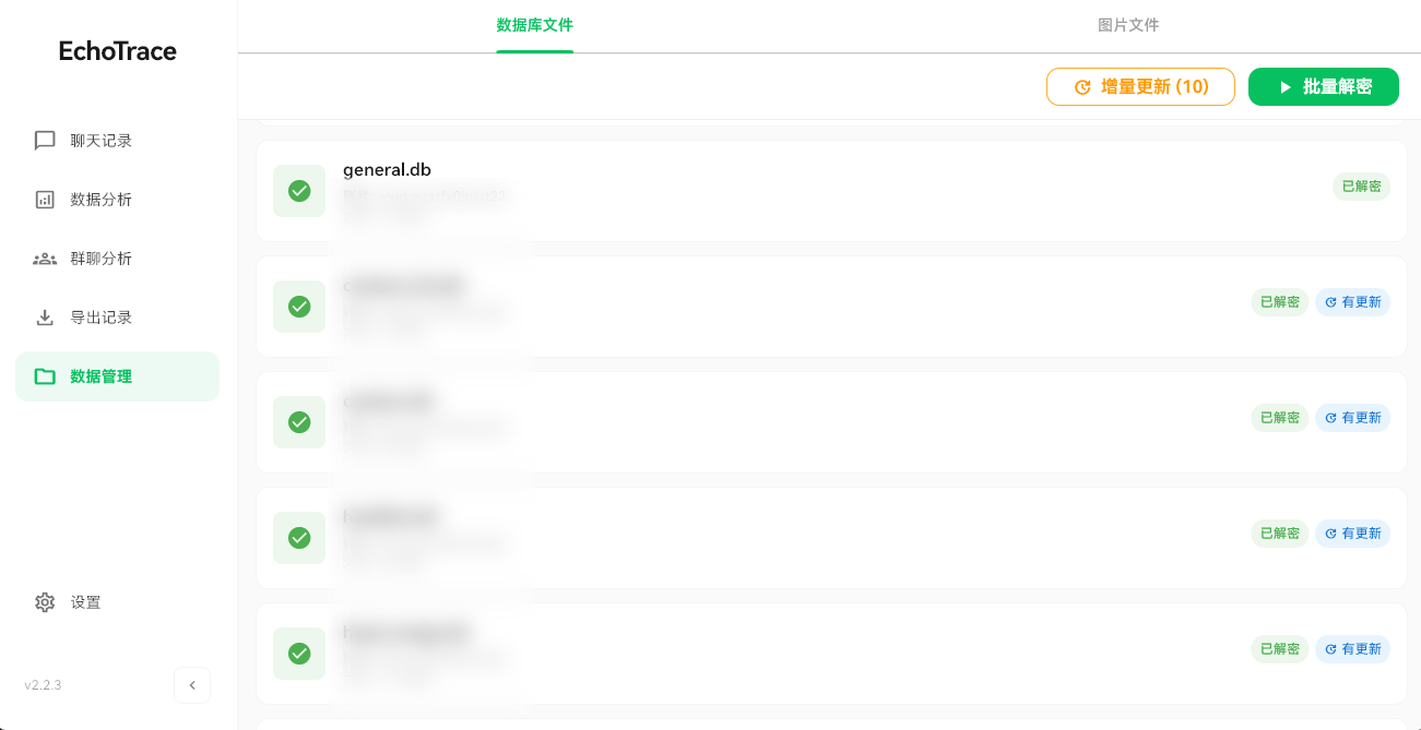 A: 必须先在“数据管理”页面点击 批量解密 且进度条走完后,导出页面才会显示会话列表。